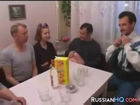 Четверо мужчин выпивают и с ними пьет рыжеволосая симпатяга. Закуски на столе нет, только "запивон", как у русских алкашей заведено. Мужики немного перепили и, конечно же, захотелось им сексуальных приключений и они стали приставать к рыжей сучке. А девушка просто без ума от бешеной "популярности", вызванной среди собутыльников. Она отдалась им, и друзья отодрали тощую симпатягу по очереди и закончали ей всю спину и попку.