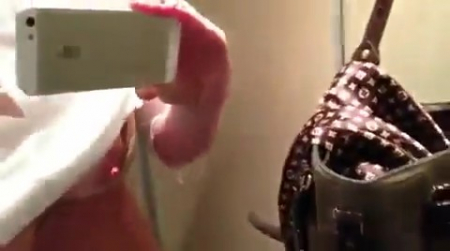 Девушка с большой грудью и айфоном снимает себя в зеркале поезда. Она мнет свою грудь и постепенно подбирается к своей киске